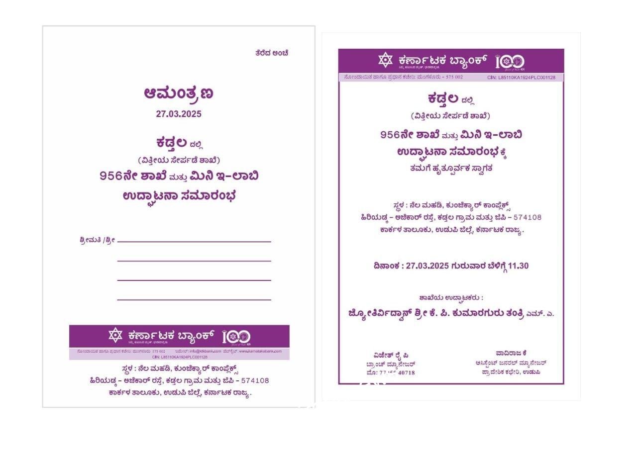 ಉಡುಪಿ: ದೇಶದ ಹೆಸರಾಂತ ಖಾಸಗಿ ಬ್ಯಾಂಕ್ ತನ್ನ 956 ನೇ ಶಾಖೆಯನ್ನು ಕಡ್ತಲದ ಕುಂಜೆಕ್ಯಾರ್ ಕಾಂಪ್ಲೆಕ್ಸ್, ಹಿರಿಯಡ್ಕ – ಅಜೆಕಾರು ರಸ್ತೆ, ಕಡ್ತಲ ಗ್ರಾಮ, ಕಾರ್ಕಳ ತಾಲೂಕಿನಲ್ಲಿ…